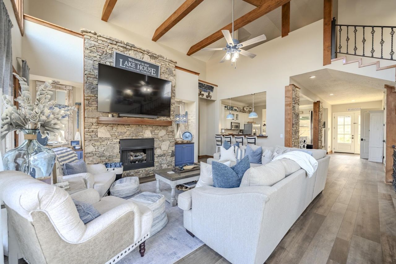 This 4br 4.5 bath water front home is located in the gated Anchor Bay Pointe of North Shore. The main floor has luxury updates throughout, including gourmet kitchen, stonewall fireplace, and hardwood floors. Large great room with lofted ceilings, renovated primary bedroom and 1/2 bath. Host all your friends/family in the upstairs bonus area, with media room, pool table, large guest room with full bathroom. On the lower floor, find an additional living area, secondary W/D, two additional bedrooms, and 2 additional full bathrooms. Relax on one of your multiple decks, all with scenic lake views. Tram to your personal deep water boat slip (with lift) in the community marina. Sold partially furnished!